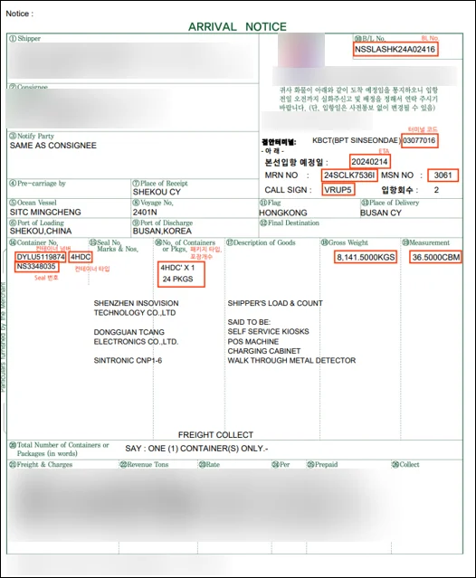위 이미지는 Arrival Notice입니다. 도착 통지서는 일반적으로 물류, 배송 등의 상황에서 수입 당사자에게 도착을 알리는 문서입니다. Arrival Notice를 아르고스의 Document Analyzer솔루션에 넣으면 어떤 결과가 나오게 될까요?