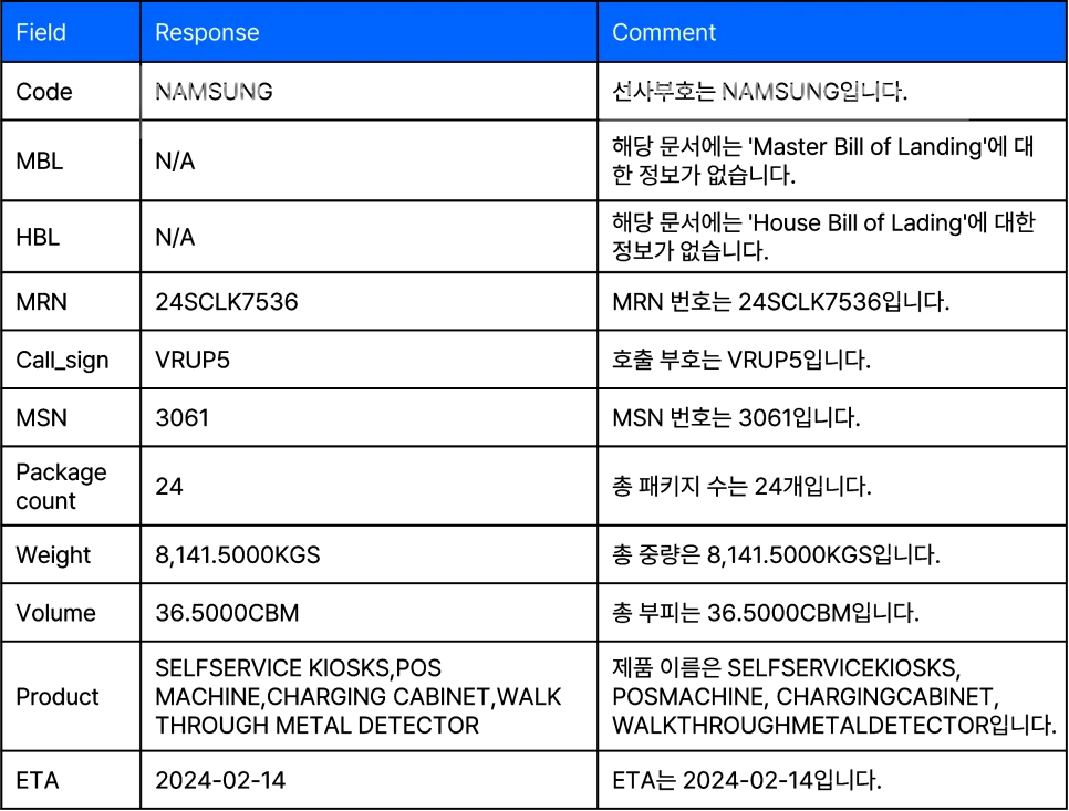 위의 결과값을 보면 Calories(칼로리)는 44kcal, Protein(단백질)은 5g, Sugars(당류)는 10g으로 도출됐습니다. 추가로 영양성분표에는 나와있지 않은 항목들 Iron(철분), Calcium(칼슘), Iodine(아이오딘)은 N/A(해당없음)로 나타났습니다. 문서 내용의 관계를 파악하고, 없는 정보나 도출이 불가능한 해석은 알아서 거절 처리한 것이죠. 정말 빠르고 정확하지 않은가요?