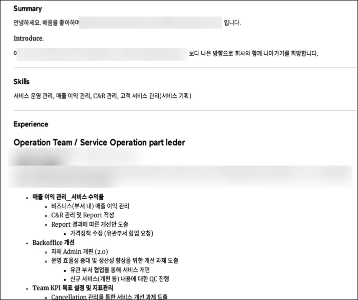 위의 결과값을 보면 근무기간, 직책 등만 뽑아낼 수 있습니다. 여기서 채용담당자는 기업에 적합한 자격요건만 볼 수 있게 됩니다. 아르고스 솔루션은 채용담당자 또는 채용 플랫폼, 기업에게 시간 및 비용을 절약할 수 있도록 1차 필터링을 진행해 주는 역할을 하는 거죠!