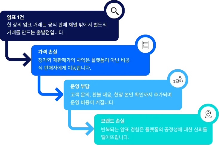 암표 문제가 반복될수록 더 크게 증가하는 것은 운영 비용입니다. 실제 손실은 판매 이후부터 시작됩니다.