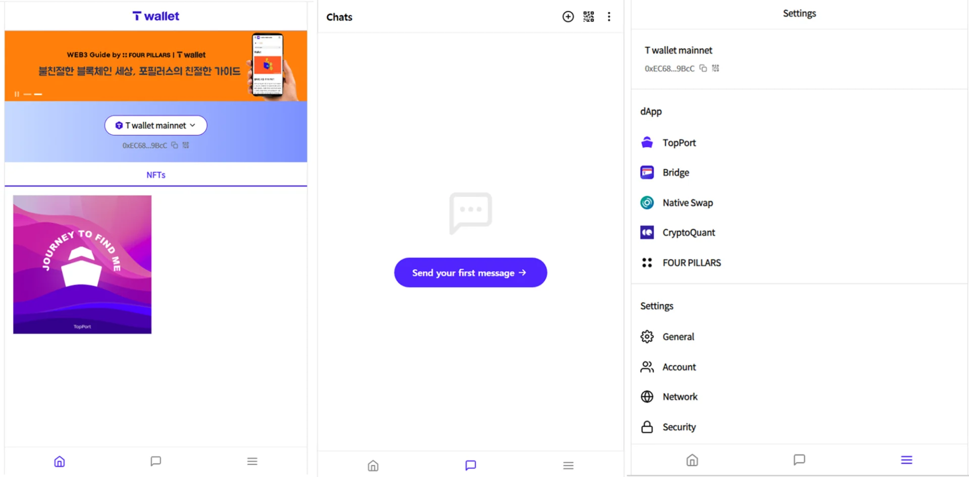 [T wallet의 홈화면, 채팅, 메뉴]
