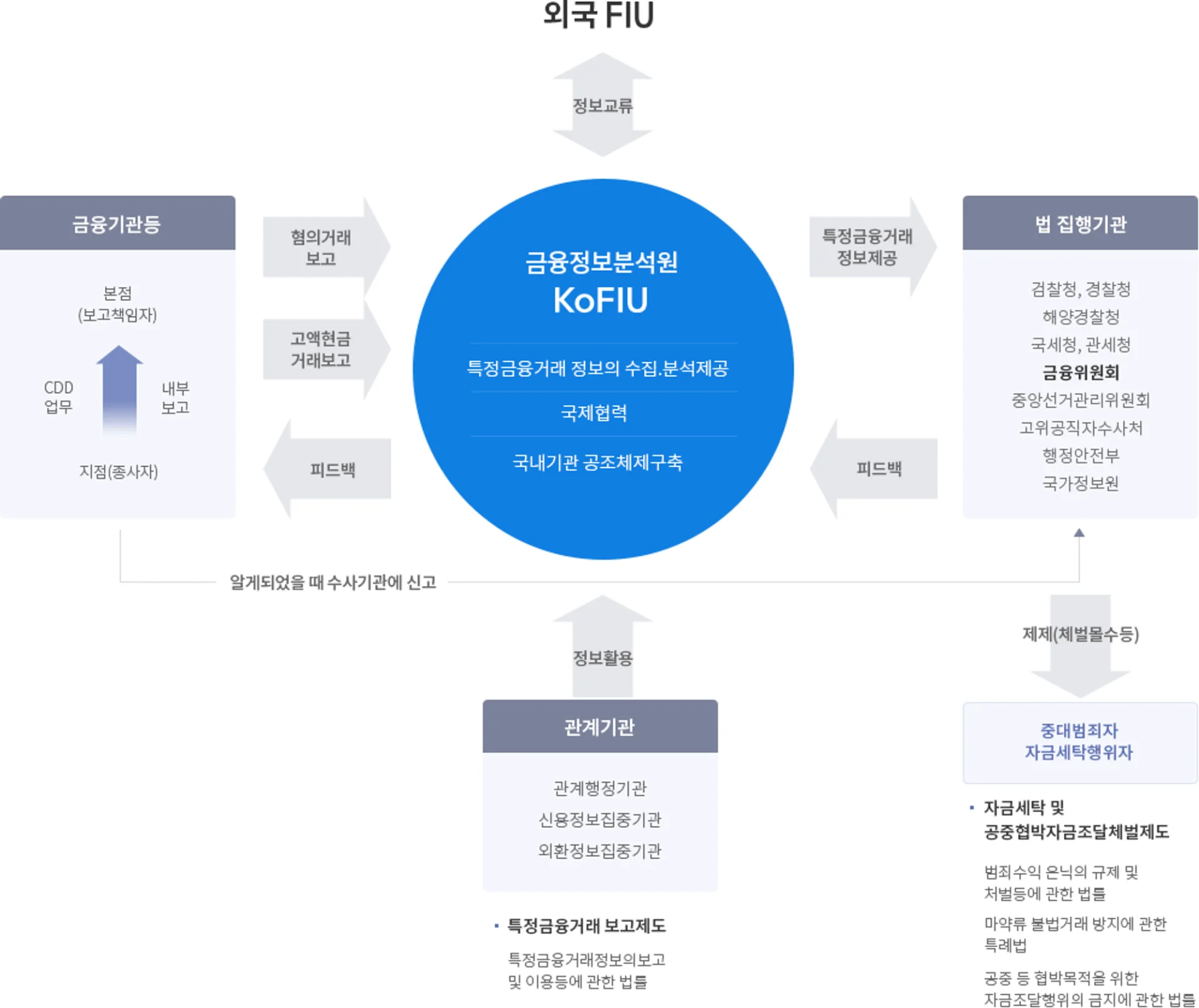 금융정보분석원의 활동은 한국에는 자금세탁과 테러자금 조달을 방지하기 위한 2가지 법령을 주축으로 하고 있습니다. (FIU 소관법류 바로가기)